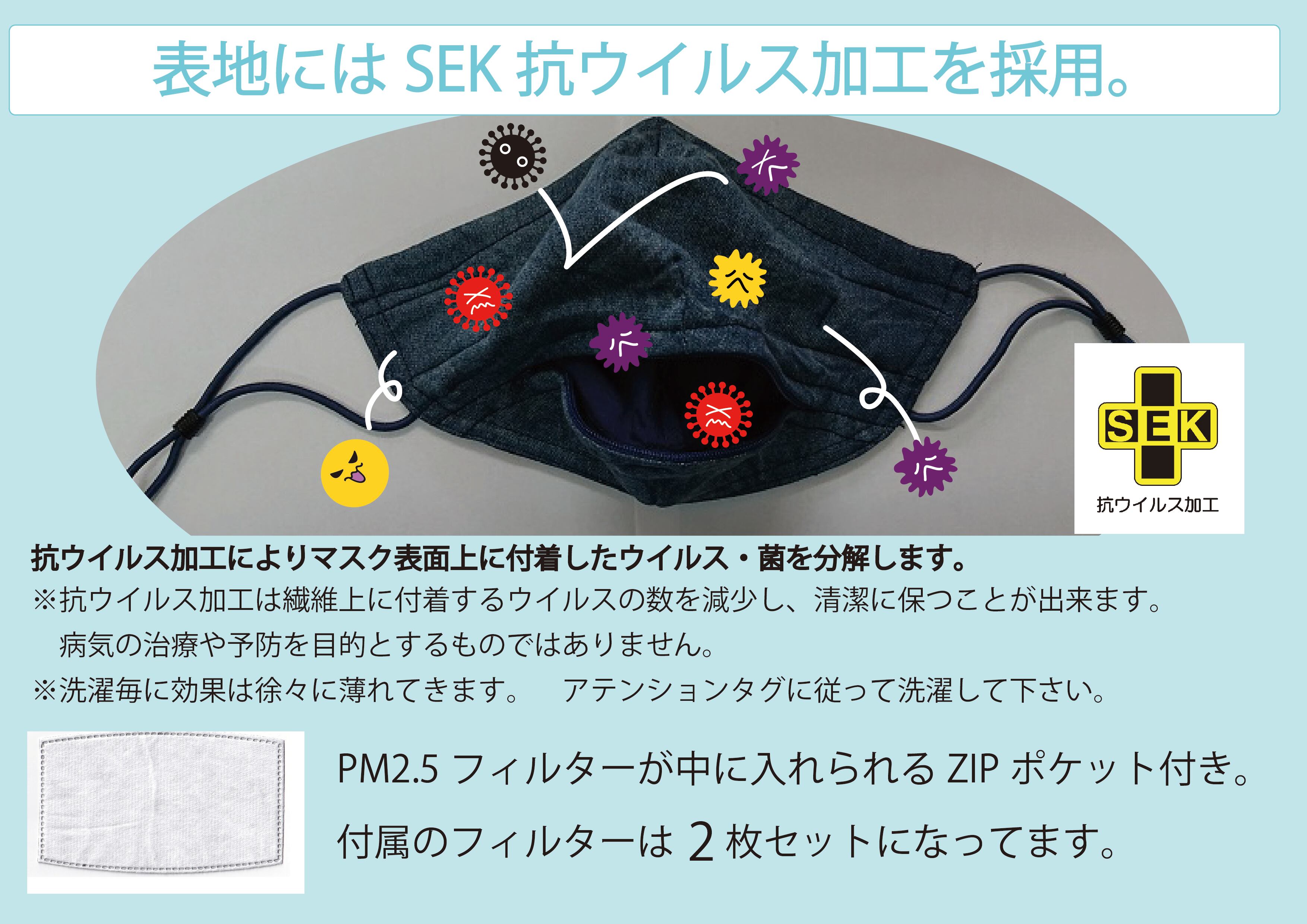 『SEK抗ウイルス加工』デニム布マスク(フィルター付き)