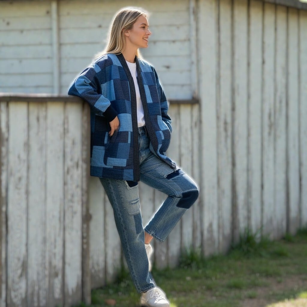 寒風寒波上等デニム半纏(ハンテン)パッチワークNAVY2 防風シート×高機能中綿仕様