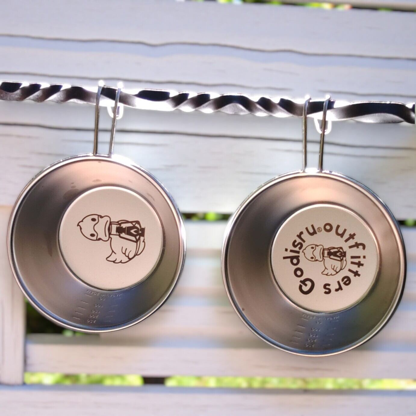 オリジナルのGodisruロゴとゴディダックがデザインされたステンレス製のシェラカップ。
